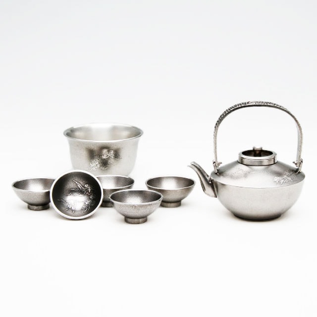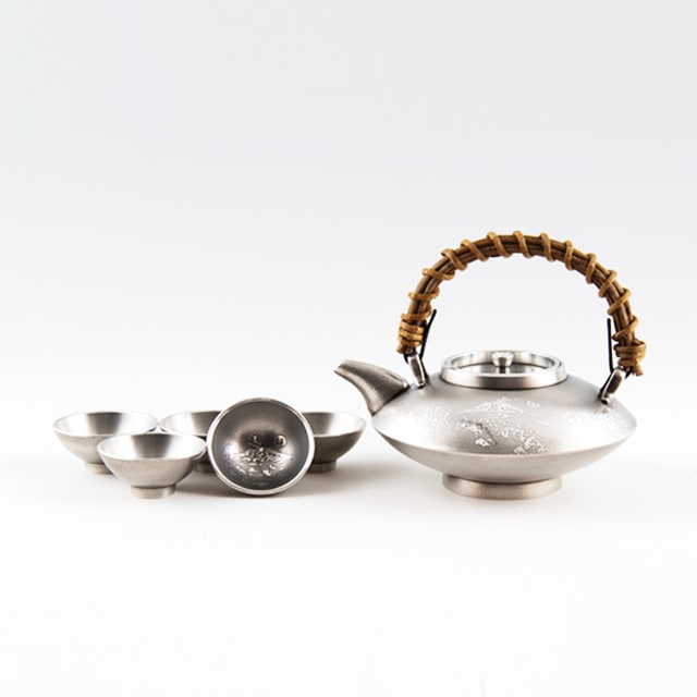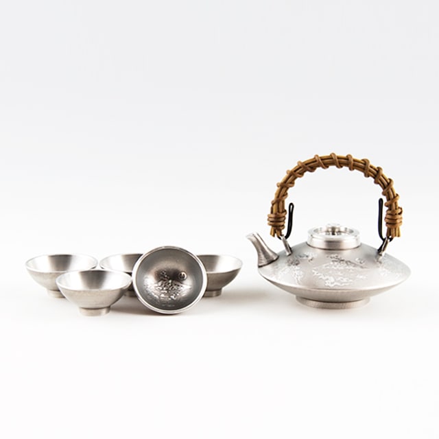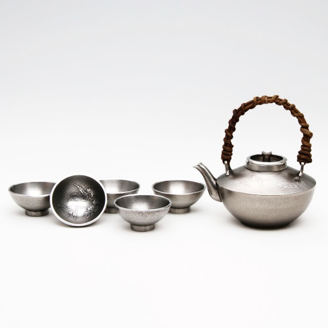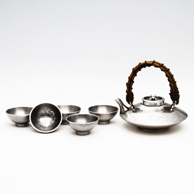 薩摩錫器 錫 黒じょか・ちょか 鶴 イブシ加工 盃5ケ 260ml 56-2 薩摩錫器工芸館 代引不可
