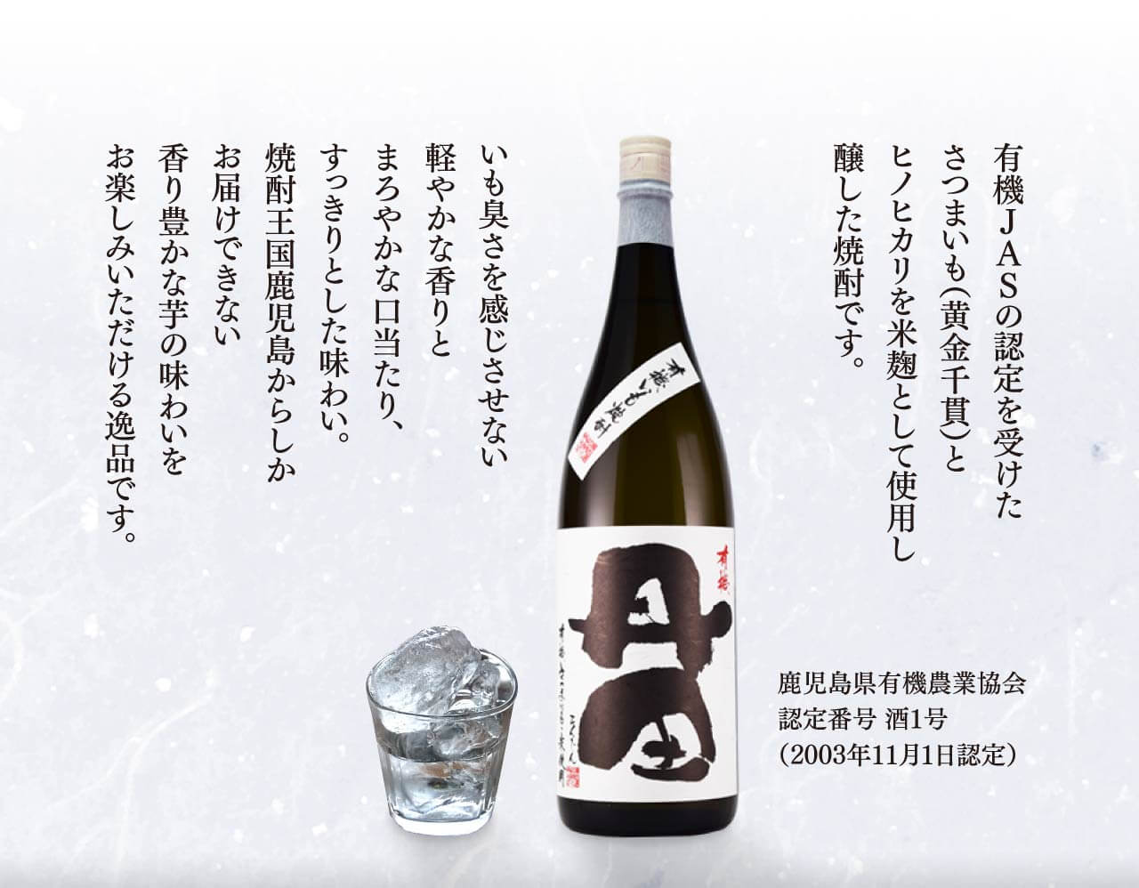 | 有機JASの認定を受けたさつまいも(黄金千貫)とヒノヒカリを米麹として使用し醸した焼酎です。原料にもこだわりたい方におすすめのオーガニック焼酎。いも臭さを感じさせない軽やかな香りとすっきりした味わいで、口当たりもまろやかな芋焼酎です。鹿児島県有機農業協会 認定番号 酒1号(平成15年11月1日認定) 原料/JAS認定さつま芋(黄金千貫)、米麹(JAS認定米ヒノヒカリ) ※北海道・東北エリアは別途運賃が1000円発生します。 高級 贈答 ギフト プレゼント 焼酎 芋焼酎 有機丹田 25度 1800ml 1.8L 白麹 本格芋焼酎 JAS 送料無料 有機 丹田 鹿児島 鹿児島県 濱田酒造 |