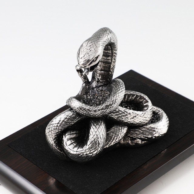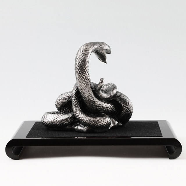 | 錫製の置物「蛇」です。 錫製の置物、蛇置物 KOURIN 黒漆加工台付です。大きな蛇に遭遇した後は、大きな幸運がやってくると言われ、長く生きていそうな蛇ほど大きな幸運がやってきます。ずっしりとした薩摩錫の重厚感と共に、幸運が現れるはずです。縁起物として記念品や贈りものにいかがでしょうか。 |