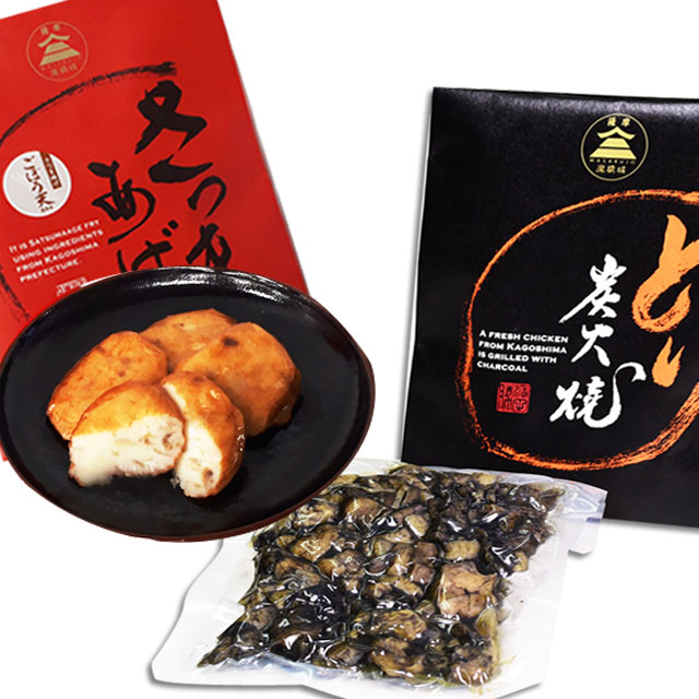 | ■原材料 | 鶏の炭火焼き:鶏肉(国内産)、食塩、ガーリック、こしょう、醤油、地酒、芋焼酎/調味料(アミノ酸等)、甘味料(サッカリンNa、甘草)、(一部に小麦・大豆を含む) さつま揚げごぼう天:魚肉(イトヨリ、スケトウ)、ごぼう、砂糖、本みりん、食塩、灰持酒、魚醤、唐辛子、揚げ油(菜種油)/加工デンプン、調味料(アミノ酸等)、甘味料(ソルビトール)、保存料(ソルビン酸K),(一部に小麦、大豆を含む) |