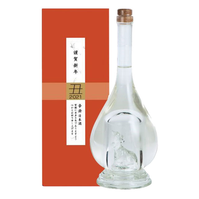 新年のお祝いに相応しい上品な香りとなめらかな口当たりの大吟醸酒を、2021年の干支「丑」をあしらった手造りの縁起ボトルでご用意いたしました。中央に細やかなガラス細工の施されたボトルはお手に取って見ていただきたい逸品です。