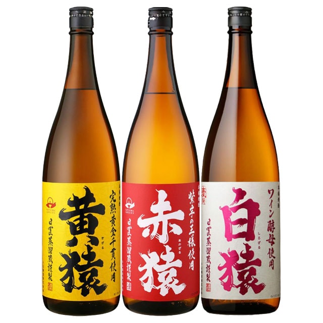 | 数あるさつまいもの品種の中でも特に希少な「農林56号」。紫色をしたこのさつまいもは、白麹で優しく醸すことでそのやわらかな風味を存分に発揮する。希少なさつまいもの個性と、その特長を余すところなく引き出す造り手の技。両者の想いは伝統の蔵で呼応し、優しくやわらかな香味の一滴一滴を生み出す「赤猿」一献の価値あり。【赤猿】 焼酎芋の代表格である「黄金千貫」。その秘めた潜在能力を引き出すために、黄金千貫を「完熟」させることで新たな道を切り開きました【黄猿】 本格焼酎造りに欠かすことのできない「酵母」。その潜在能力を最大限引き出す。厳選した二条大麦と、まるで果実の様な香りを生み出す「ワイン酵母」を使用し、ゆっくりと低温発酵で醸し、じっくりと低温蒸留。グラスに注いだときの甘く気品ある香り、優しく包み込むような味わいとキレが生まれた、本格麦焼酎【白猿】 |