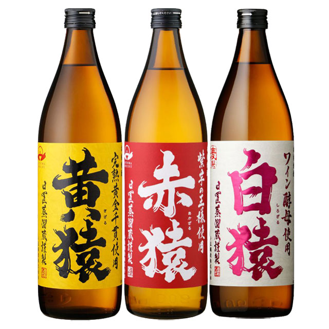 | 数あるさつまいもの品種の中でも特に希少な「農林56号」。紫色をしたこのさつまいもは、白麹で優しく醸すことでそのやわらかな風味を存分に発揮する。希少なさつまいもの個性と、その特長を余すところなく引き出す造り手の技。両者の想いは伝統の蔵で呼応し、優しくやわらかな香味の一滴一滴を生み出す「赤猿」一献の価値あり。【赤猿】 焼酎芋の代表格である「黄金千貫」。その秘めた潜在能力を引き出すために、黄金千貫を「完熟」させることで新たな道を切り開きました【黄猿】 本格焼酎造りに欠かすことのできない「酵母」。その潜在能力を最大限引き出す。厳選した二条大麦と、まるで果実の様な香りを生み出す「ワイン酵母」を使用し、ゆっくりと低温発酵で醸し、じっくりと低温蒸留。グラスに注いだときの甘く気品ある香り、優しく包み込むような味わいとキレが生まれた、本格麦焼酎【白猿】 |