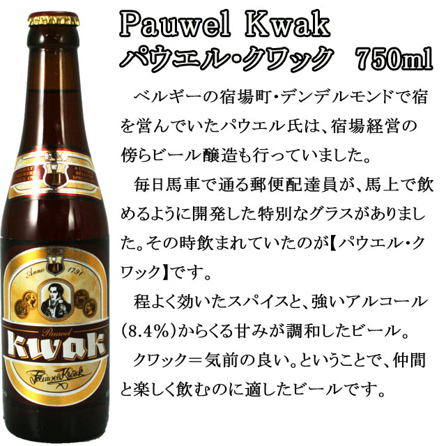 | ベルギーの宿場町・デンデルモンドで宿を営んでいたパウエル氏は、宿場経営の傍らビール醸造も行っていました。 毎日馬車で通る郵便配達員が、馬上で飲めるように開発した特別なグラスがありました。その時飲まれていたのが【パウエル・クワック】です。 程よく効いたスパイスと、強いアルコール(8.4%)からくる甘みが調和したビール。クワック=気前の良い。ということで、仲間と楽しく飲むのに適したビールです。 気前のいいビール、父の日にいかがですか? | |