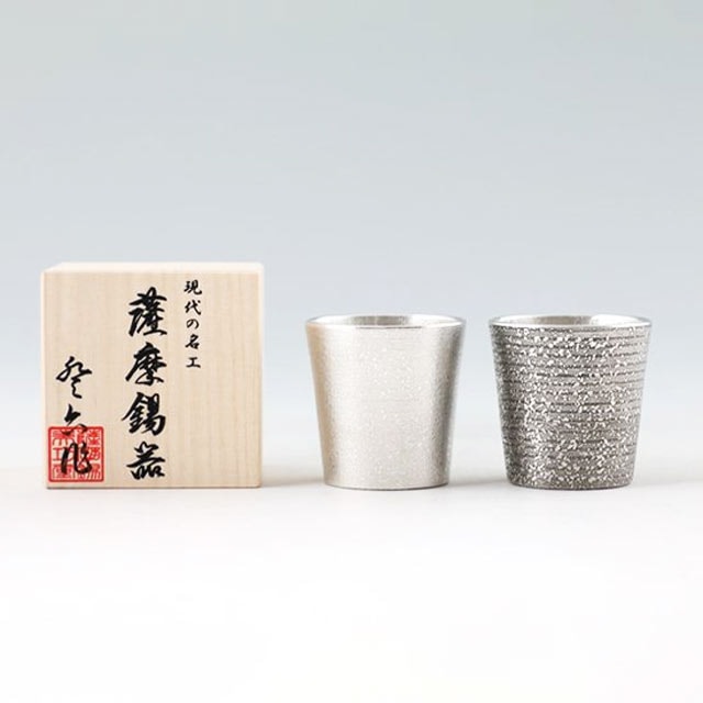 | 錫は、昔から入れた飲み物をまろやかにすると言われてきました。 鹿児島に根付く"芋焼酎"も、鹿児島県の伝統工芸品に認定されている「薩摩錫器」と一緒に楽しむことできっとさらにおいしく感じられます。 錫の質感が手になじむ、ちょうどよいサイズの「ぐい呑」をシンプルに仕上げ、2色のセットにしました。 シンプルなデザインで若い方からご年配の方まで幅広い方にお使いいただけます。 ギフトとしての贈り物にも喜ばれる一品です。 |