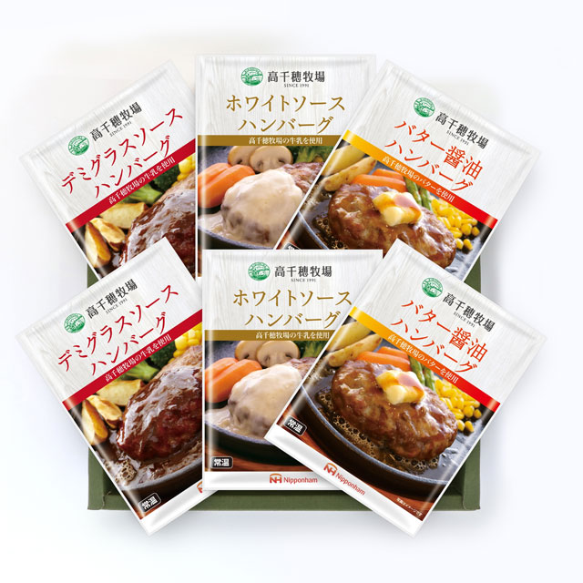 | ■内容量 | デミグラスソースハンバーグ 115g×2個、ホワイトソースハンバーグ 115g×2個、バター醤油ハンバーグ 115g×2個。 |