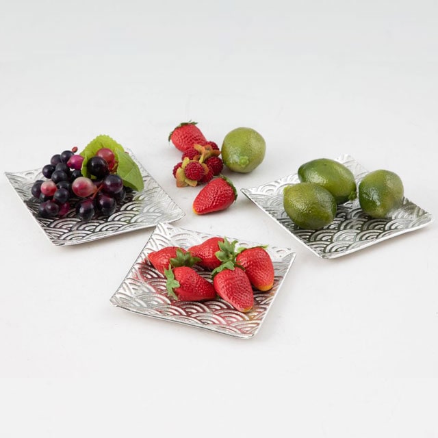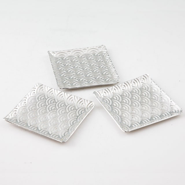 | 錫の青海波柄、切子小皿角型 3枚セットです。 ご自宅でのご使用はもちろん、お祝いや記念日の贈り物としても喜ばれています。人気の小皿を贈り物にしやすい3枚セットにいたしました。 青海波の柄をあしらった小皿は、普段遣いにも特別な日のおもてなしにも使いやすいとご好評いただいています。 |