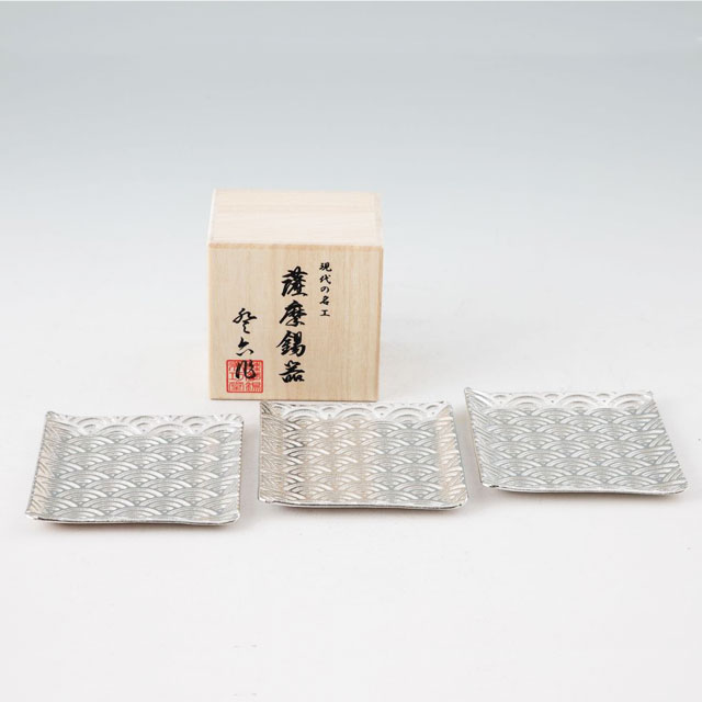 薩摩錫器 錫 切子小皿角型 青海波 3枚セット 2010-2-3 薩摩錫器工芸館 代引不可