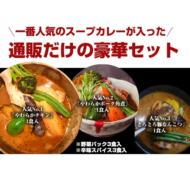 | ■内容量 | やわらかチキンスープカレー(人気1位) 3食 やわらかポーク角煮スープカレー(人気1位) 3食 とろとろ豚なんこつスープカレー(人気1位) 3食 野菜パック 9食分 、辛みスパイス 9食分 ※メイン入りのスープと野菜パックはそれぞれ真空パックしてあります。 |