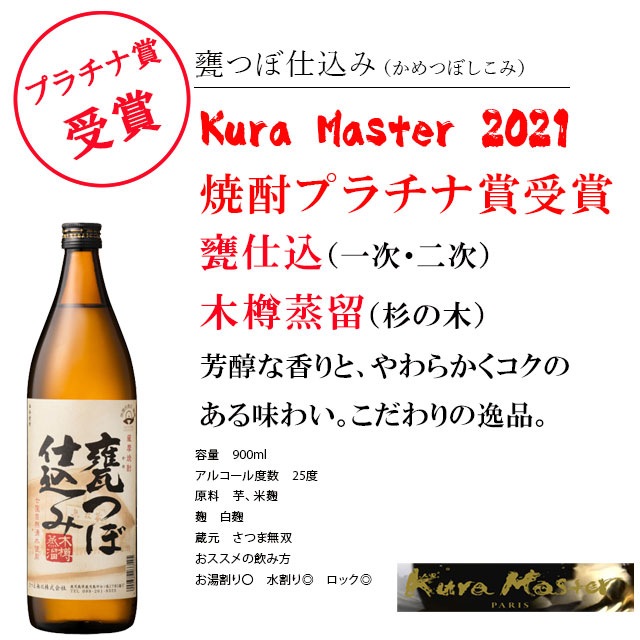 | Kura Master 2021 プラチナ賞受賞! かめつぼで仕込み、発酵を終えたもろみを、杉の木でできた木樽蒸留器を使って蒸留した薩摩焼酎。芳醇な香りと、やわらかくコクのある味わいの伝統的製法のこだわりの一品。 焼酎 芋焼酎 甕つぼ仕込み 無双 さつま無双 25度 甕つぼ |