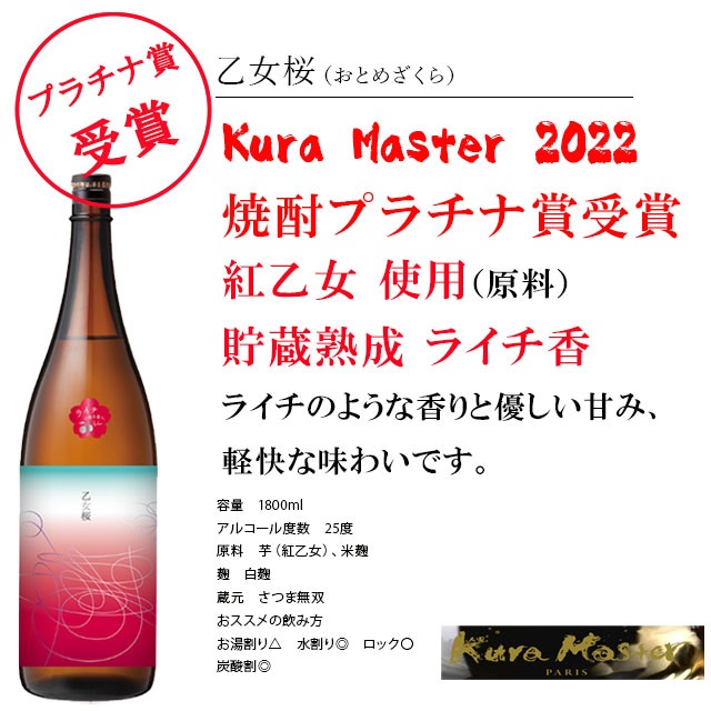 | IWSC2019最高賞&Kura Master2022プラチナ賞受賞セット! 世界に認めらた焼酎飲み比べセット! IWSC2019最高賞受賞!「だいやめ」は、独自の技術で誕生した香熟芋は、アロマリッチな香気を引きだす成分を増幅させたさつま芋。酒類の国際品評会「インターナショナル ワイン&スピリッツ コンペティション(IWSC)2019」の焼酎部門のトロフィー(最高賞)を受賞。 Kura Master 2022 プラチナ賞受賞! 「乙女桜」は、「紅乙女芋」を使用。収穫後、一定期間貯蔵することで、一層旨みが凝縮した紅乙女芋。原料管理の難しさと仕込みの絶妙なタイミングで造り、口に含むと広がるライチのような香りと優しい甘み、軽快な飲み口は飲む人を心地よい空間に誘ってくれます。 |