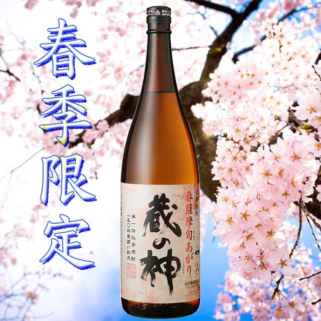 | 【予約商品】3月4日より発送予定となっております。他の商品と同時に購入した場合も、3月4日出荷になりますので、ご了承ください。発売まで楽しみにお待ちください。 原酒を150日間以上貯蔵し、最高の状態に仕上げました。鹿児島県産の良質のさつまいもを原料に、春ならではの穏やかな味わいです。限定出荷の為、売切れ次第終了となります。ご了承ください。 季節限定 春薩摩旬あがり 春薩摩 旬あがり 蔵の神 黒麹 焼酎 芋焼酎 山元酒造 25度 900ml |