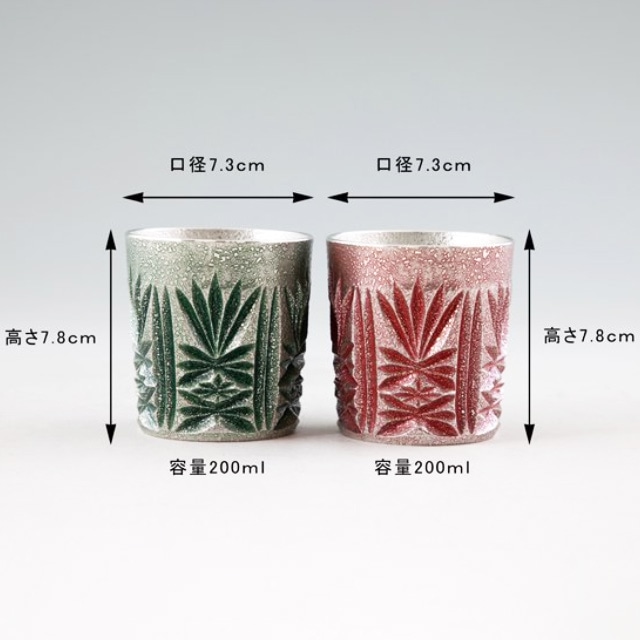| 薩摩切子をモチーフにした繊細な文様の緑と赤がモダンなタンブラーセットです。 飽きのこない繊細な美しさは職人の伝統的な手法に現代的な感覚から生まれました。 錫のタンブラーで、日本酒や、ワイン、焼酎、ビール、冷たいドリンクはいかがでしょうか。 錫は、昔から入れた飲み物をまろやかにすると言われてきました。 シンプルなデザインで若い方からご年配の方まで幅広い方にお使いいただけます。 ギフトとしての贈り物にも喜ばれる一品です。 |