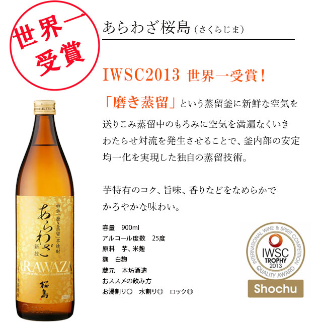 | 本格焼酎あらわざは、新開発の「磨き蒸留(2009年・特許取得)」により生み出された芋焼酎です。蒸留もろみに対流をおこす独自技術により、芋特有のコク、旨味、香りなどをなめらかでかろやかな味わいへと仕上げた「磨き蒸留かろやか仕立て」。南薩摩伝統の技に新技(あらわざ)を加えた、かろやかなおいしさをお楽しみください。 焼酎 芋焼酎 あらわざ 桜島 25度 900ml 白麹 鹿児島 鹿児島県 本坊酒造 IWSC 世界一 金賞受賞 金賞 |