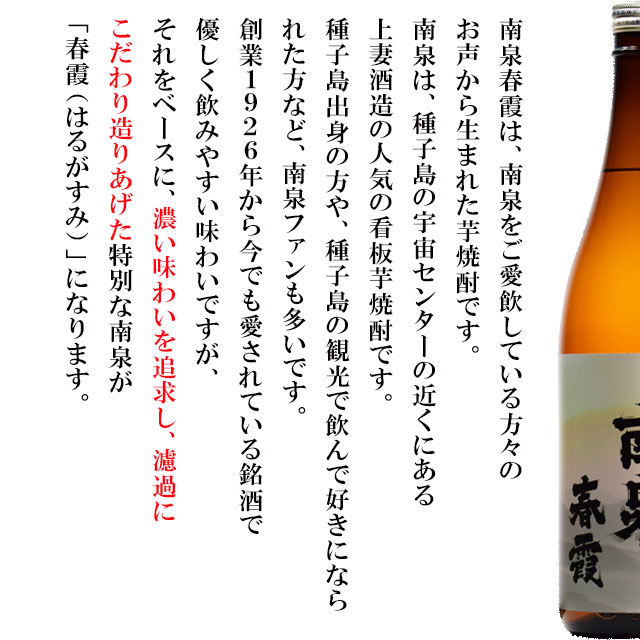 焼酎は、色々な飲み方で自由に楽しめる特徴があります。水割り、お湯割り、ストレート、ロック、炭酸割り、お茶割り、レモンを入れてなど、体調に合わせて、度数を低くしたりと、手軽に自分好みの飲み方ができ、他のお酒とはまた違う自由なお酒です。まずは、ストレートで焼酎の味わいを感じて、その後は、好きな飲み方で、自分に合った飲み方を見つけて楽しんでください。 穏やかで親しみのある味わいが特徴の種子島芋焼酎「南泉(なんせん)」。南泉をご愛飲頂いているお客様の中で「昔はもう少し個性的だった。」「もうちょっとクセがあったら。」「香りがもう少し強くても良いかな。」などの感想やレビューを参考に今回蔵元と共同で造り上げました。 「南泉春霞」は、従来の南泉に比べ濾過、撹拌を抑え、香り、旨みを残した仕上がりになっております。時折白くにごっている場合もありますが、旨み成分を残した証であり、うっすらとにごっている様から『春霞(はるがすみ)』と命名しました。南国の果実を想わせる香りや原料芋「白さつま」の持つ独特で優雅な香り、また生で飲むと、芋を蒸した香ばしい味わいを感じられ、飲み飽きない旨さを堪能できます。 300本のみの限定販売で、瓶詰めでは味わいと香りを確かめながら試行を重ね、きつ過ぎず、且つ旨さを感じるように何度も濾過の回数や原酒の撹拌、貯蔵期間などを考慮した限定品です。 |
