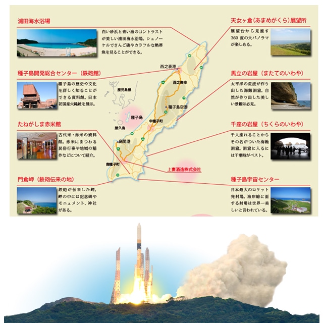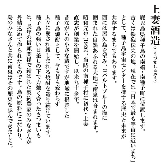 | 実り豊かな美しい島「種子島」の地元南種子の芋にこだわり、創業当初から守り続けるがんこ蔵 上妻酒造のここでしか手に入れることができない、特別な南泉を心ゆくまでお楽しみください。さつまいもの聖地から造られた種子島芋焼酎をひとくち飲めば、豊かな味わいが口の中に広がります。
