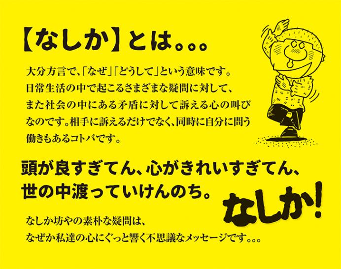 | 全麹仕込みの原酒をブレンドし、飲みやすさの中にもコクのある麦焼酎。商品のラベルには「なしか坊や」の素朴な「なしか?」が描かれています。(13種類あるそうです。)「なしか」は大分方言で何故?なんでだろ?と言う意味です。 | |