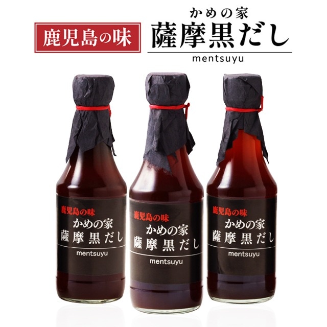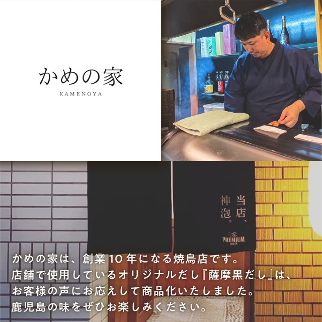 | 鹿児島の味 かめの家 薩摩黒だしは、創業10年になる焼鳥店『かめの家』で使用しているオリジナルだしが、お客様の声によって商品化されました。かつおだしの旨味を最大限に引き出し、鹿児島の甘口醤油で優しい甘さのおだしです。