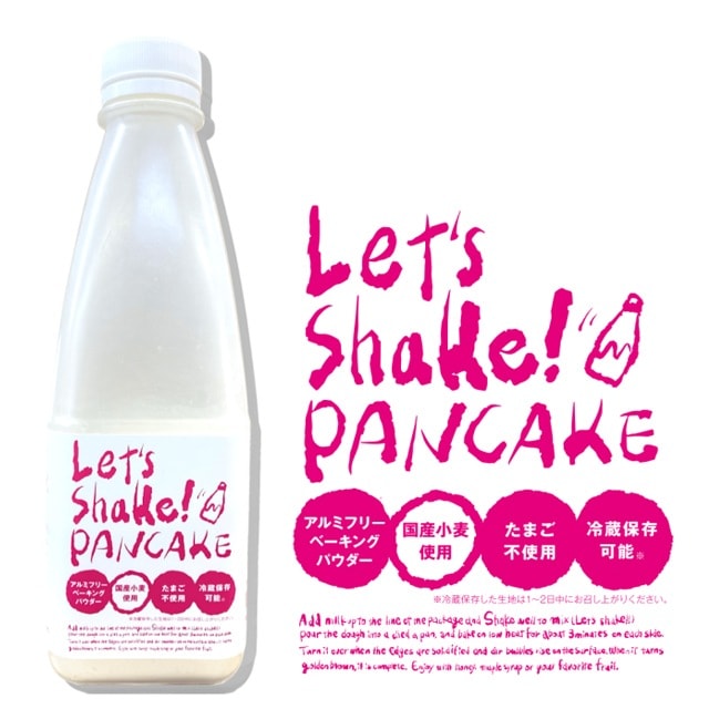 | シェイクでパンケーキLet's Shake! PANCAKEは、家族で楽しくシェイクしながら、皆様に笑顔になってつくっていただきたい。そんな想いのつまった商品です。 泡立て器も計量カップもボールも必要なく、小麦粉が飛び散る心配もない。家族みんなで楽しく作れる、ボトルタイプのパンケーキミックスです。 【作り方】 商品ラベル記載のミルクラインまで、牛乳または豆乳を注いでいただき、約90秒間楽しくシェイクしてください。 フライパンにバターまたはその他の食用油を引き、弱火で約3分焼き、端が固まって表面に気泡が上がってきたら裏返します。 そのまま裏面も3分ほど焼き、両面ともきつね色になったら完成です。お好みではちみつやメープルシロップ、フルーツなどを添えてお召し上がりください。 ※粉が丸く固まっている場合があります。牛乳や豆乳など入れる前にもよく振ってください。 | |