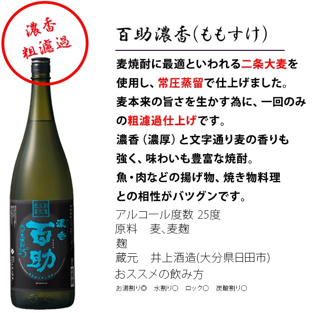 | 大分むぎ焼酎の1800ml瓶×6本セットです。飲み比べ 知心剣25度1800ml(藤井酒造 大分県) 濃香 百助 25度 1800ml(井上酒造 大分県)安心院蔵 25度 1800ml(縣屋酒造 大分県) KUROBOZE 25度 1800ml (久家本店 大分県) ほけぼっぽ 25度 1800ml (久家本店 大分県) なしか 25度 1800ml ※北海道・東北地区は、別途送料1000円が発生します。 |