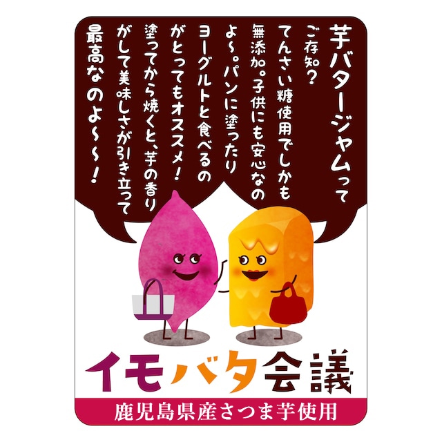 | イモバタ会議芋バタージャムは、さつまいも好きのあなたへ。 芋好きのためのこだわり贅沢ジャムです。 体に優しい無添加食品を使用しており、トーストやバケットに最適です。 朝の食卓に優しい芋バタージャムを いかがでしょうか? 【おすすめの食べ方】 食パン・バケットに芋バタージャムを塗ってトーストで焼いたら最高です!! | |