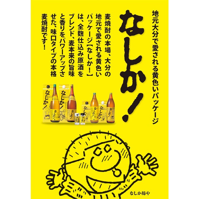 | 全麹仕込みの原酒をブレンドし、飲みやすさの中にもコクのある麦焼酎。商品のラベルには「なしか坊や」の素朴な「なしか?」が描かれています。(13種類あるそうです。)「なしか」は大分方言で何故?なんでだろ?と言う意味です。 | |