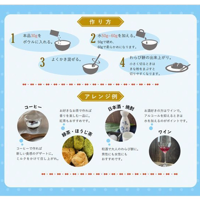 (1袋30gで1食分作れます) 「水で出来るわらび餅粉」は、加熱いらず、手間いらずで、食べたい分だけ作れます。水を加えて混ぜ、きな粉をまぶせば、わらび餅の出来上がり。 水以外でも、お好きなお飲み物で作る事ができ、お子様にはお気に入りのジュースで、大人はコーヒー、お酒好きな人は日本酒やワインでぜひお試しください。 1袋で約10食分作ることができ、ご家族や様々なパーティーシーンで盛り上がること間違いなし! チャック式の袋なので、そのまま封をして常温で保管することができます。 |