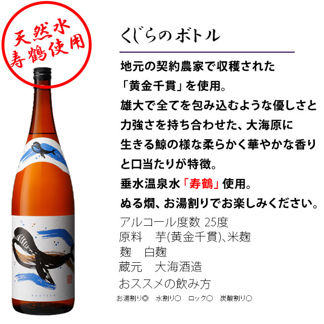 | 大海原に生きる鯨のような雄大な優しさと力強さを持ち合わせた焼酎。コガネセンガン・白麹・常圧蒸留で造った芋焼酎のスタンダードで、芋の香り豊かでやわらかな口あたりが特徴。垂水温泉水「寿鶴」を使用。ぬる燗、お湯割りでお楽しみください。 | |