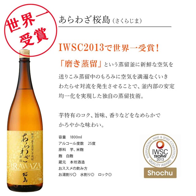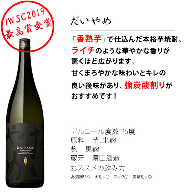 | 厳選!人気芋焼酎をセレクト! 焼酎を飲まれる方がもらったら嬉しい芋焼酎ばかりで、1.8Lを3本で飲み比べも楽しめます。 「三岳」 屋久島が日本で初めて世界自然遺産に1993年と登録され、今やプレミア級の実力をもつ本格芋焼酎。屋久島の天然名水「屋久島縄文水」で仕込み、まろやかな飲み口とスッキリと飲みやすいと評判です。ロック・水割りがおすすめ! IWSC2013世界一受賞!あらわざは、蒸留もろみに対流をおこす独自技術により、芋特有のコク、旨味、香りなどをなめらかでかろやかな味わいへと仕上げた「磨き蒸留仕立て」。 IWSC2019世界一受賞「だいやめ」、ライチ香る芋焼酎、ここ近年香る焼酎が人気が出てきた中の、パイオニア的な存在です。炭酸割もおすすめ。 焼酎を飲まれる方が頂くと喜ぶ芋焼酎ばかりをセットにしています。父の日・誕生日・御礼・お祝い事・お中元・お歳暮でも最適な贈答セット ギフトラッピング、メッセージカード希望の方は、備考欄に記載か、メールを送ってください。 芋焼酎 飲み比べ 売れている 人気 おすすめ 大人気 贈答 焼酎セット 焼酎 ランキング 飲み比べセット 芋焼酎セット 三岳 あらわざ ARAWAZA DAIYAME だいやめ 1800ml 3本セット |