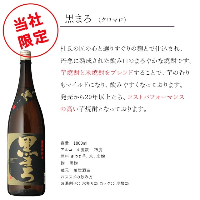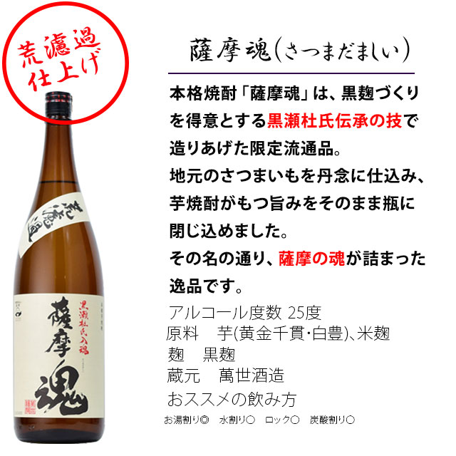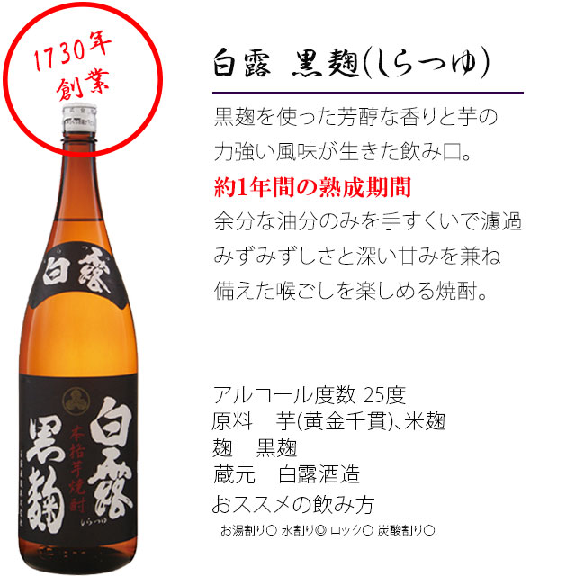 「白露 黒麹」さつまいも伝承の地で造られる創業1730年の白露(しらつゆ)酒造が造っている黒麹焼酎。 熟成期間にもこだわり、みずみずしさと深い甘みを兼ね備えた喉ごしを楽しめる焼酎。 「薩摩魂」黒瀬杜氏伝承。地元のさつまいもを丹念に仕込み、芋焼酎がもつ旨みをそのまま瓶に閉じ込めました。その名の通り、薩摩の魂が詰まった逸品。 「黒まろ」(くろまろ)当社限定品。長年地元鹿児島で愛される、洗練された味わい。杜氏の匠の心と選りすぐりの麹とで仕込まれ、丹念に熟成された飲み口のまろやかな焼酎。 焼酎を飲まれる方が頂くと喜ぶ芋焼酎ばかりをセットにしています。父の日・誕生日・御礼・お祝い事・お中元・お歳暮でも最適な贈答セット ギフトラッピング、メッセージカード希望の方は、備考欄に記載か、メールを送ってください。 |
