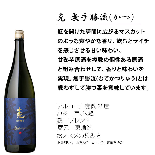 | だいやめ・克 無手勝流・BEYOND GODAI 1800ml セットになります。炭酸割りで楽しめるセットになります。 だいやめは、IWSC2019年焼酎最高賞受賞し、克(かつ)・BEYOND GODAI(ビヨンドゴダイ)も、人気が出てきている焼酎!焼酎も、芋の種類、熟成方法、酵母でワイン酵母・清酒酵母を使用したり、色々な香りをイメージさせてくれる焼酎が誕生してきており、人気がでてきております。昔の芋焼酎、芋臭いのが好きな方にはお勧めできないセットになります。このセットは焼酎のにおいが少し苦手に感じている方などにおすすめです。 ぜひ飲み比べをお楽しみください!! |