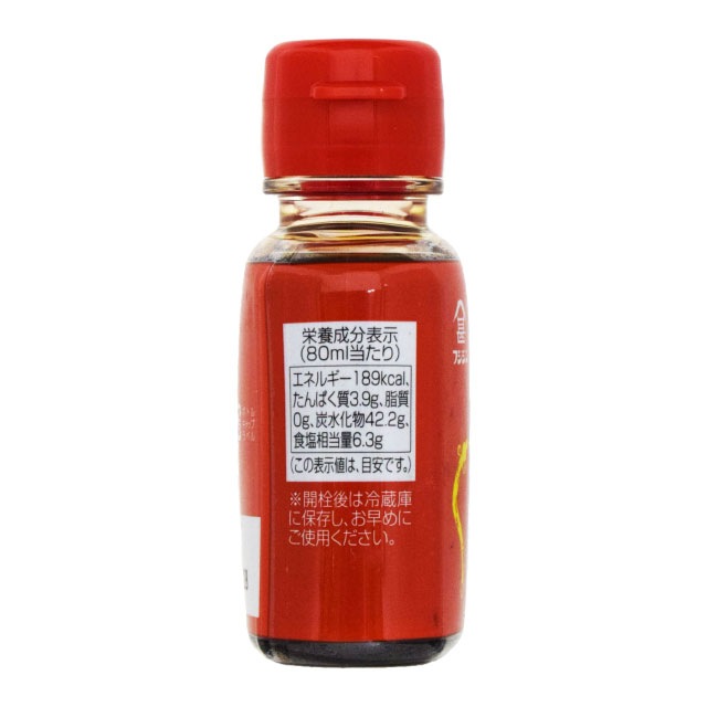 | ■原材料 | 醤油(小麦を含む、国内製造)、砂糖、水飴、植物性蛋白加水分解物(大豆を含む)、米発酵調味料、食塩/アルコール、カラメル色素、増粘剤(加工デンプン)、調味料(アミノ酸等)、甘味料(ステビア) |