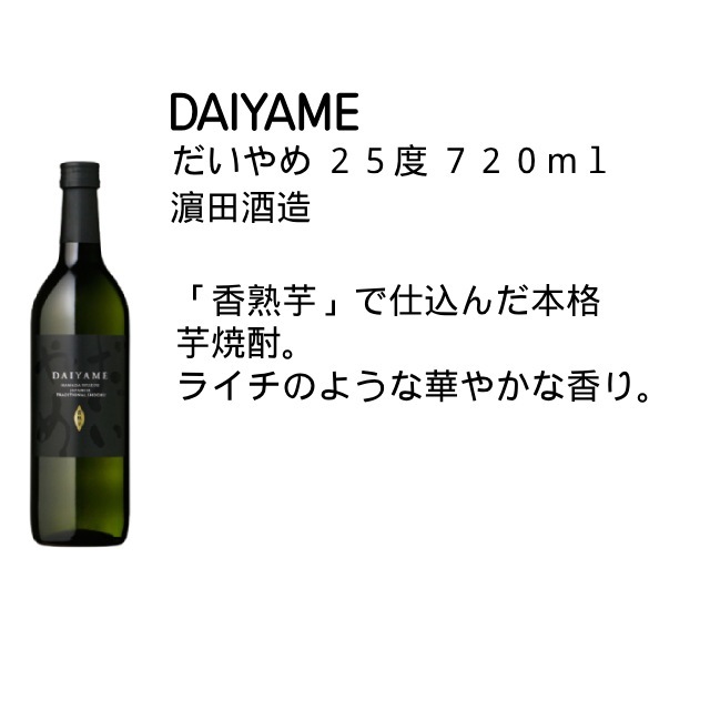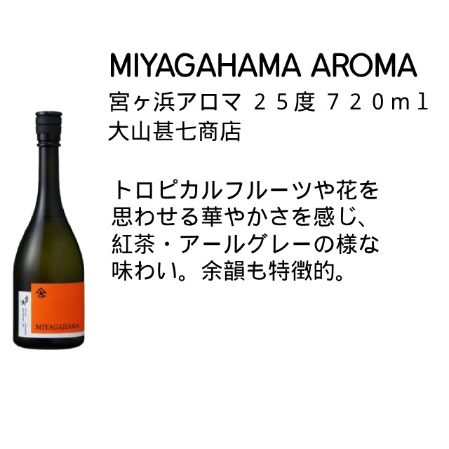 | だいやめ・宮ヶ浜アロマのセットになります。焼酎も、芋の種類、熟成方法、酵母でワイン酵母・清酒酵母を使用したり、色々な香りをイメージさせてくれる焼酎が誕生してきており、また人気がでてきております。昔の芋焼酎、芋臭いのが好きな方にはお勧めできないセットになります。このセットは焼酎のにおいが少し苦手に感じている方などにおすすめです。飲み方は、炭酸割がおすすめの商品になっております! ぜひ飲み比べをお楽しみください!! |
