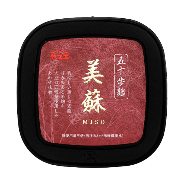 | 五十歩麹美蘇は、芳醇な大麦と甘みのある米のあわせ麹を使用した調合味噌です。大豆に対してあわせ麹を5倍量使用しております。通常の味噌より麹の配合割合を高くすることにより、薫りと甘みの強い味噌になりました。今までにないあわせ麹の豊かな味わいをお楽しみください。 | |