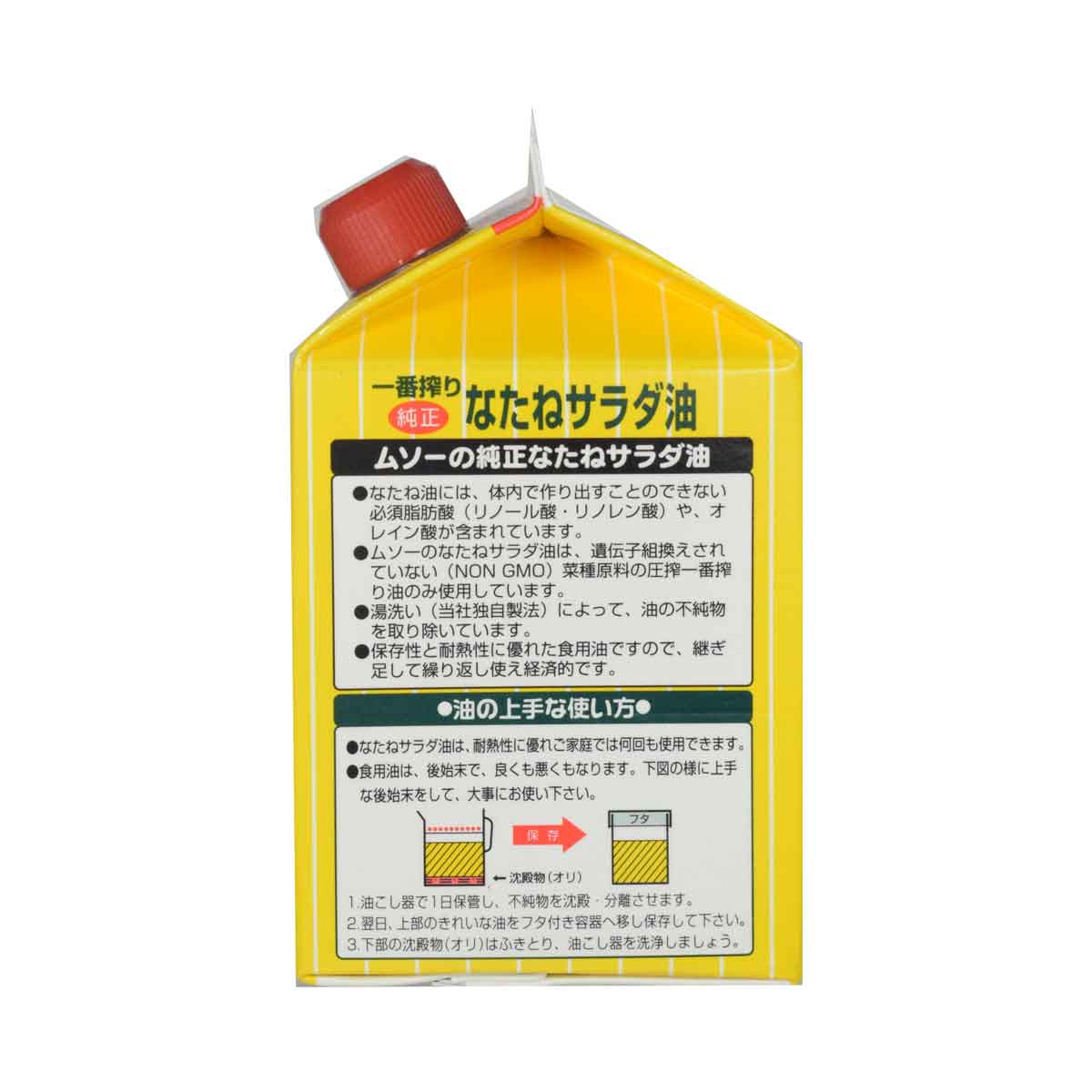 | ☆なたね油には体内で作り出すことのできない必須脂肪酸(リノール酸、リノレン酸、オレイン酸)が含まれています。 ☆遺伝子組換え原料不使用、一番搾りのなたねサラダ油です。 ☆「湯洗い」によって油の不純物を取り除いています。 ☆揚げ油として継ぎ足して繰り返し使え、経済的です。 ☆紙パック入りですので、使用後のパッケージは小さくたためます。 | |