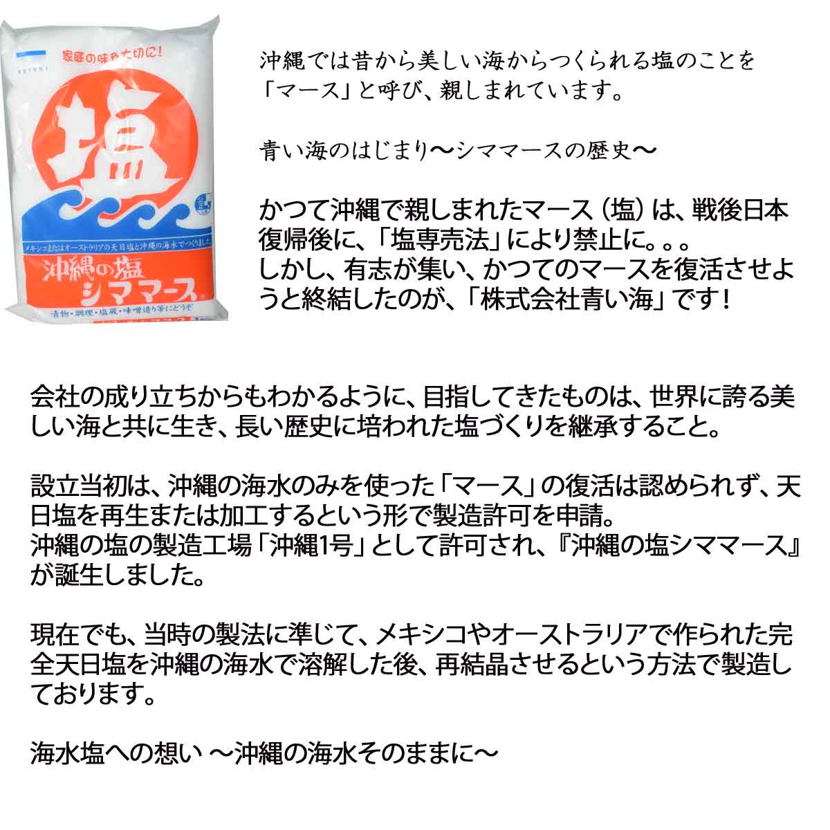 | 四方を海に囲まれた沖縄では、美しい豊かな海からつくり出された塩を「マース」と呼び、大切に受け継いできました。 しかし、日本復帰後、塩専売法の規制によってこの伝統的な製法は禁止。すると、県内の至る所で沖縄の伝統食となじまないという弊害が起きました。 その事態から、昔ながらの「マース」を復活させようと有志が集い、設立したのが「株式会社青い海」の原点です。 | |