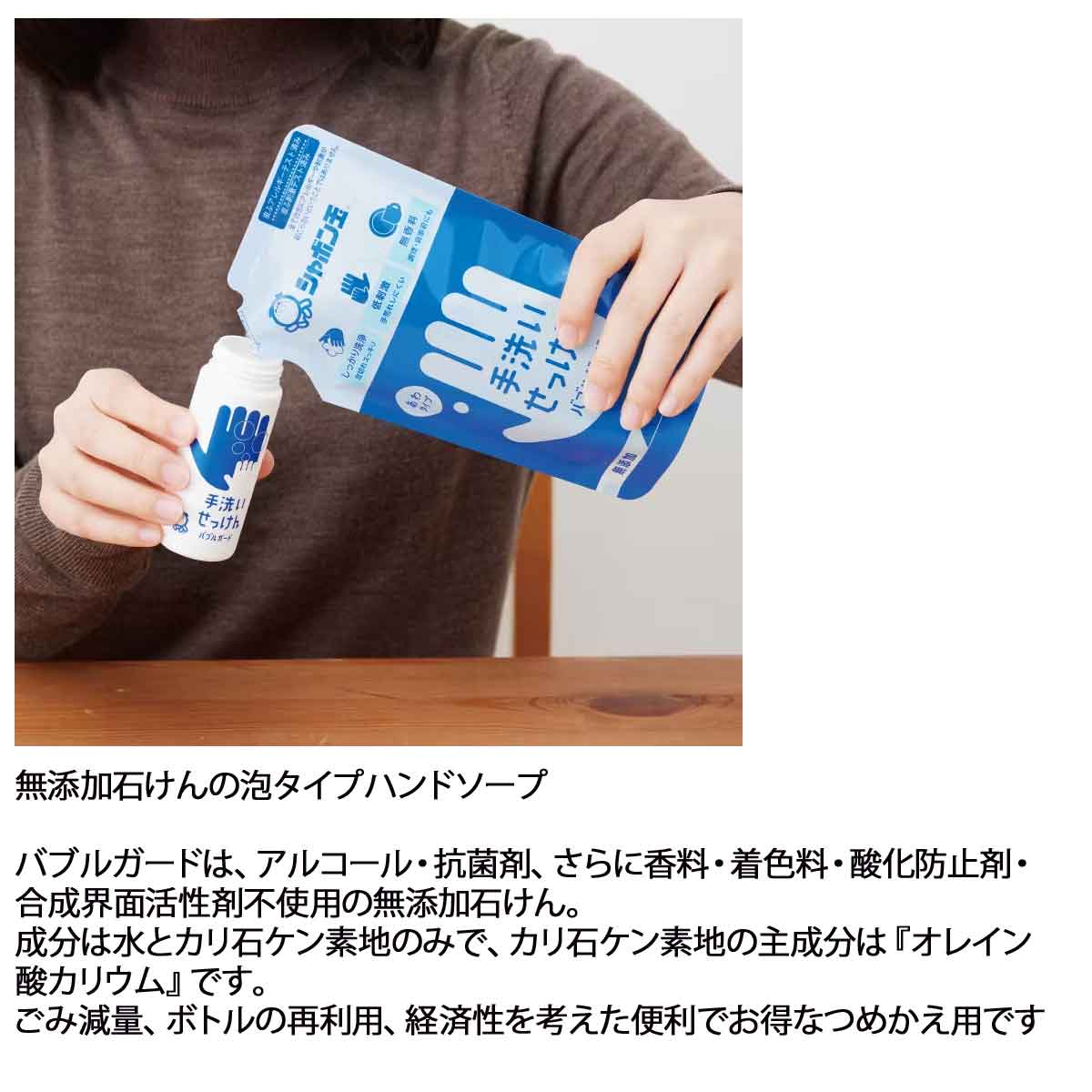 | 無添加石けんの泡タイプハンドソープ! バブルガードは、アルコール・抗菌剤、さらに香料・着色料・酸化防止剤・合成界面活性剤不使用の無添加石けん。 成分は水とカリ石ケン素地のみで、カリ石ケン素地の主成分は『オレイン酸カリウム』です。 ごみ減量、ボトルの再利用、経済性を考えた便利でお得なつめかえ用です。 | |