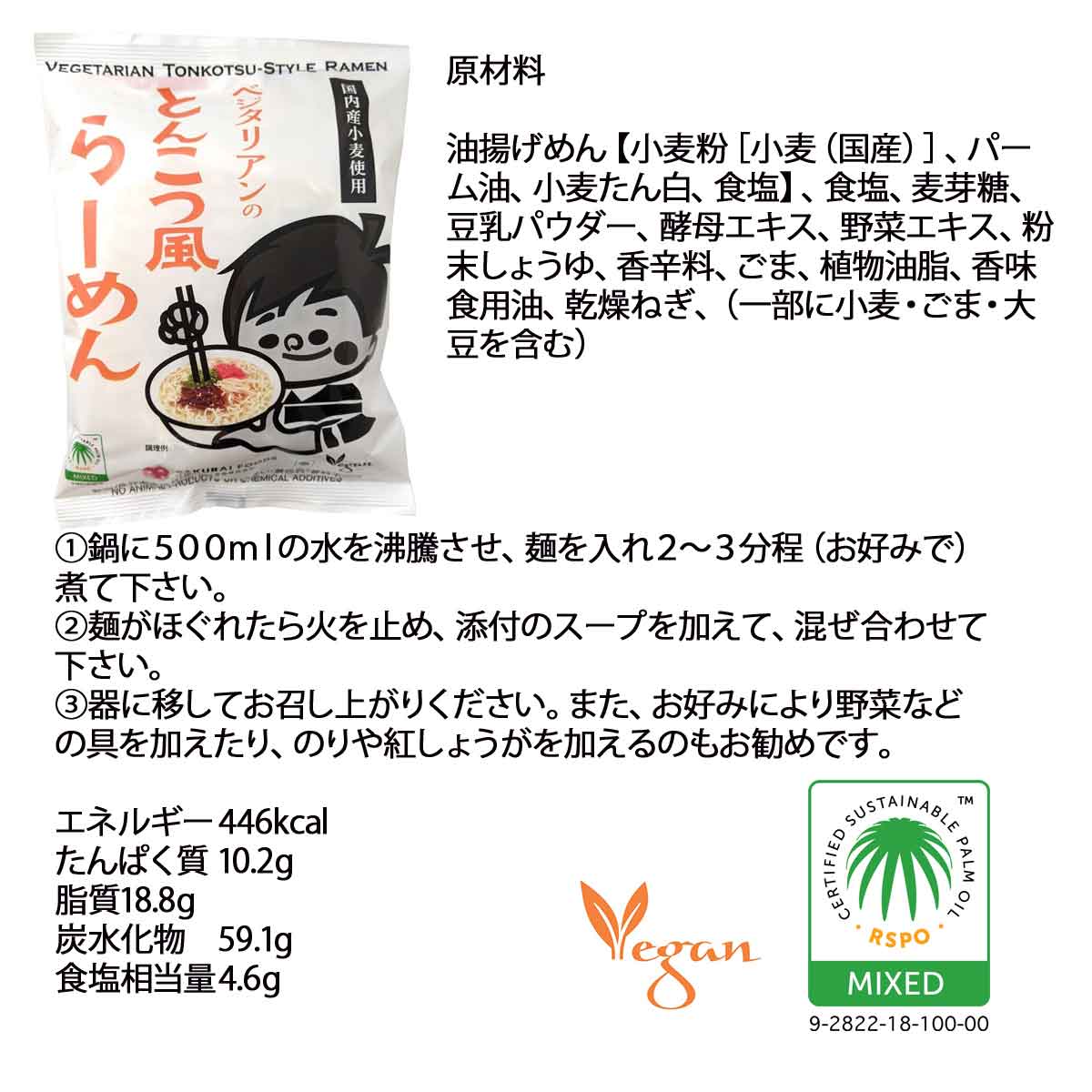 | 肉・魚・乳製品等の動物性原材料を一切使用していません。 麺は国内産小麦粉を原料にし、揚げ油は植物油を使用した無かんすい麺です。 野菜の旨みが溶けこんだコクのあるスープをベースに豆乳のまろやかさが加わったあっさりとんこつ風ラーメンです。 | |