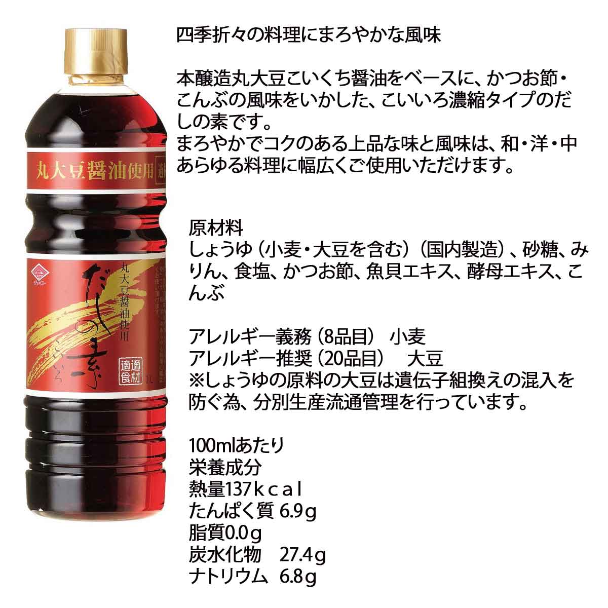 | ■原材料 | 四季折々の料理にまろやかな風味 本醸造丸大豆こいくち醤油をベースに、かつお節・こんぶの風味をいかした、こいいろ濃縮タイプのだしの素です。 まろやかでコクのある上品な味と風味は、和・洋・中あらゆる料理に 幅広くご使用いただけます。 |