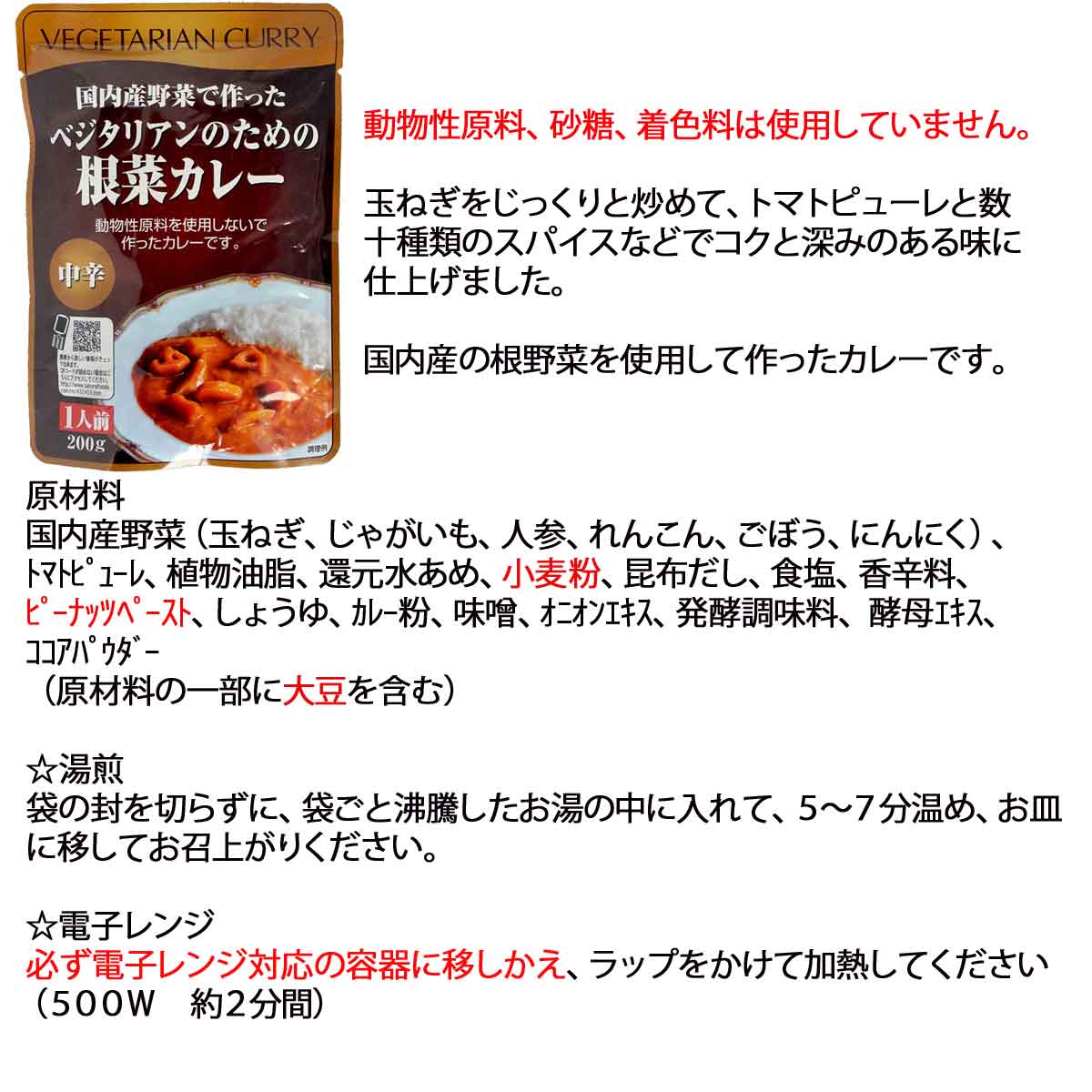 | 玉ねぎをじっくりと炒めて、トマトピューレと数十種類のスパイスなどでコクと深みのある味に仕上げました。 国内産の根野菜を使用して作ったカレーです。 動物性原料、砂糖、着色料は使用していません。 | |