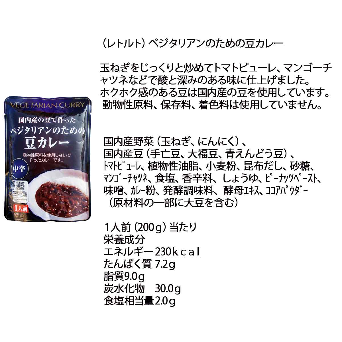 | 玉ねぎをじっくりと炒めてトマトピューレ、マンゴーチャツネなどで酸と深みのある味に仕上げました。 ホクホク感のある豆は国内産の豆を使用しています。 動物性原料、保存料、着色料は使用していません。 | |