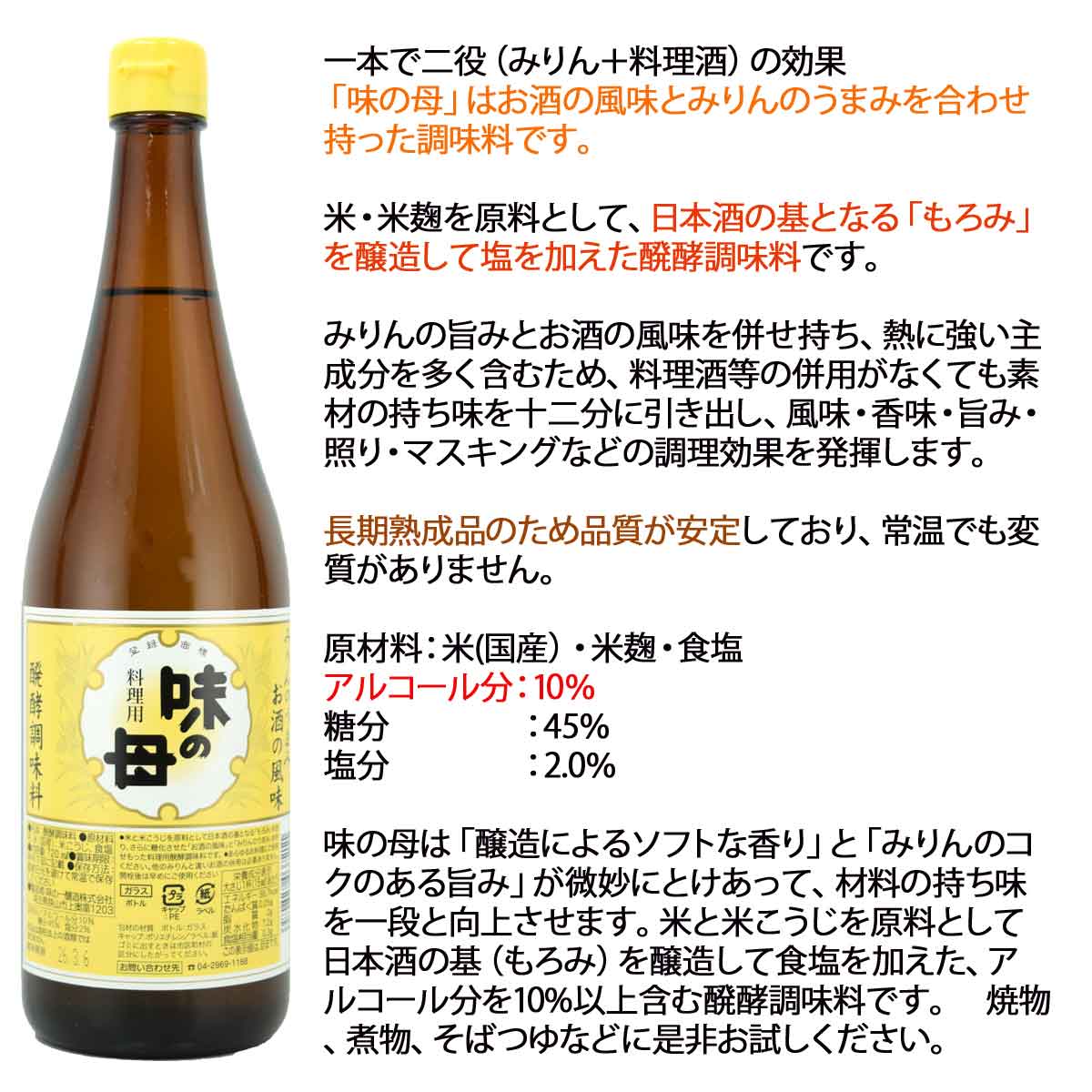 | 米・米麹を原料として、日本酒の基となる「もろみ」を醸造して塩を加えた醗酵調味料です。 みりんの旨みとお酒の風味を併せ持ち、熱に強い主成分を多く含むため、料理酒等の併用が なくても素材の持ち味を十二分に引き出し、風味・香味・旨み・照り・マスキングなどの調理効果を発揮します。 | |