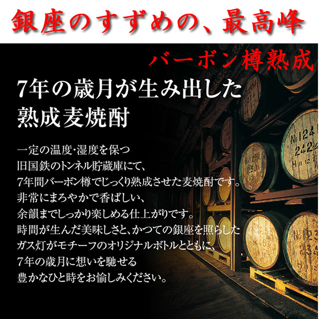 | 一定の温度・湿度を保つ旧国鉄のトンネル貯蔵庫にて、7年間バーボン樽でじっくり熟成させた麦焼酎。 非常にまろやかで香ばしい、余韻までしっかり楽しめる仕上がりです。 おすすめの飲み方は、深い味わいと長く展開していく余韻を堪能していただけるオンザロックです。 時間が生んだ美味しさと、かつての銀座を照らしたガス灯がモチーフのオリジナルボトルとともに、 7年の歳月に想いを馳せる豊かなひと時をお愉しみください。 | |