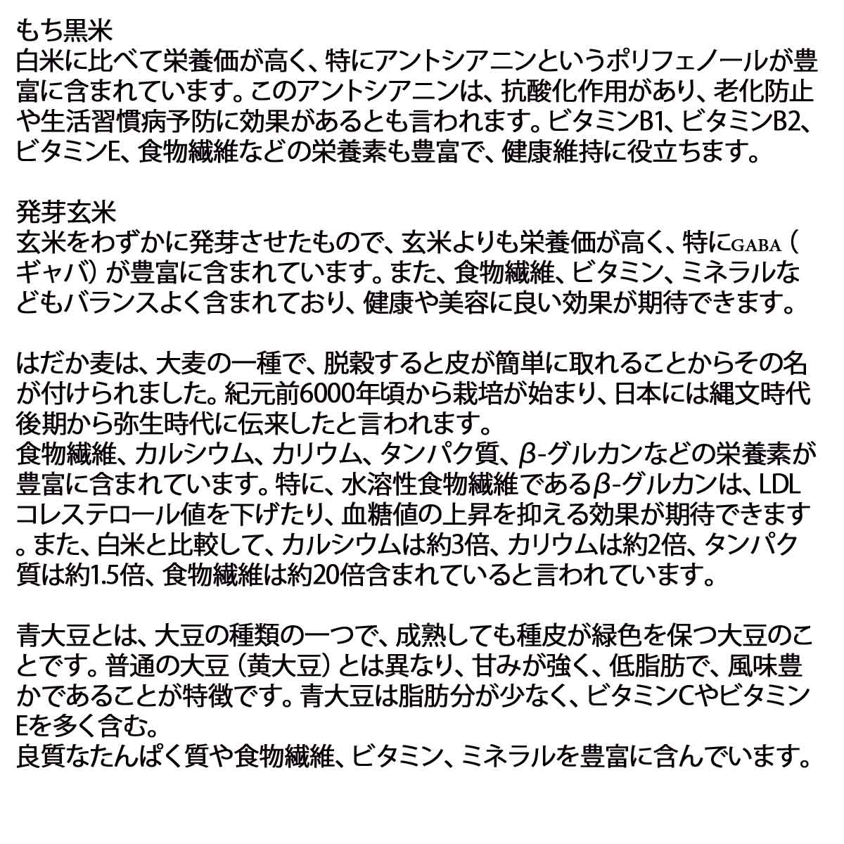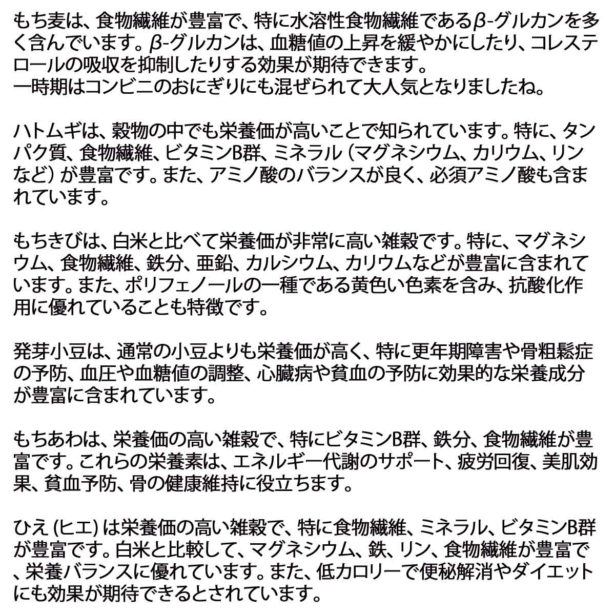 | ■原材料 | 発芽もち赤米、黄大豆、発芽黒大豆(黒千石50%、黒豆50%)、発芽もち玄米、発芽もち黒米、発芽玄米、はだか麦、発芽青大豆、もち麦、ハト麦、もちきび、発芽小豆、とうもろこし、もちあわ、ひえ |
