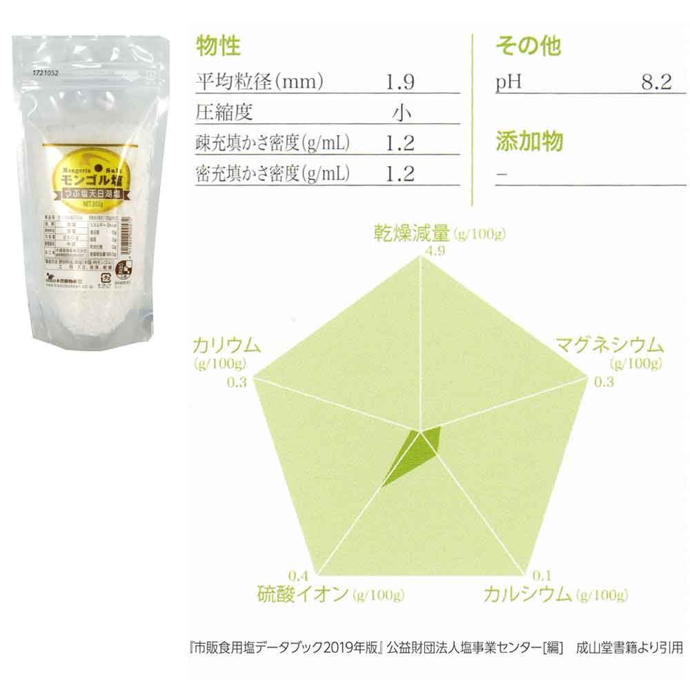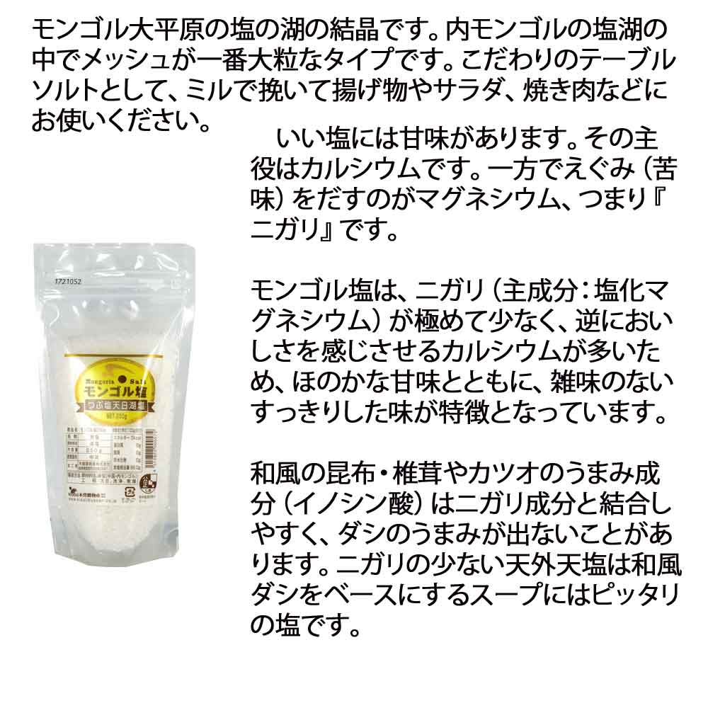 | モンゴル大平原の塩の湖の結晶です。内モンゴルの塩湖の中でメッシュが一番大粒なタイプです。こだわりのテーブルソルトとして、ミルで挽いて揚げ物やサラダ、焼き肉などにお使いください。 | |