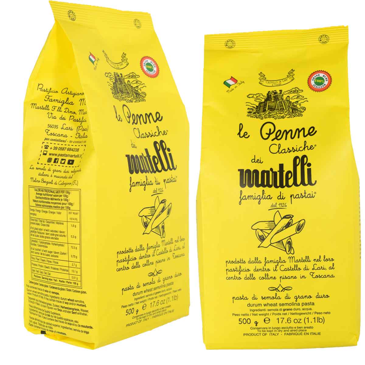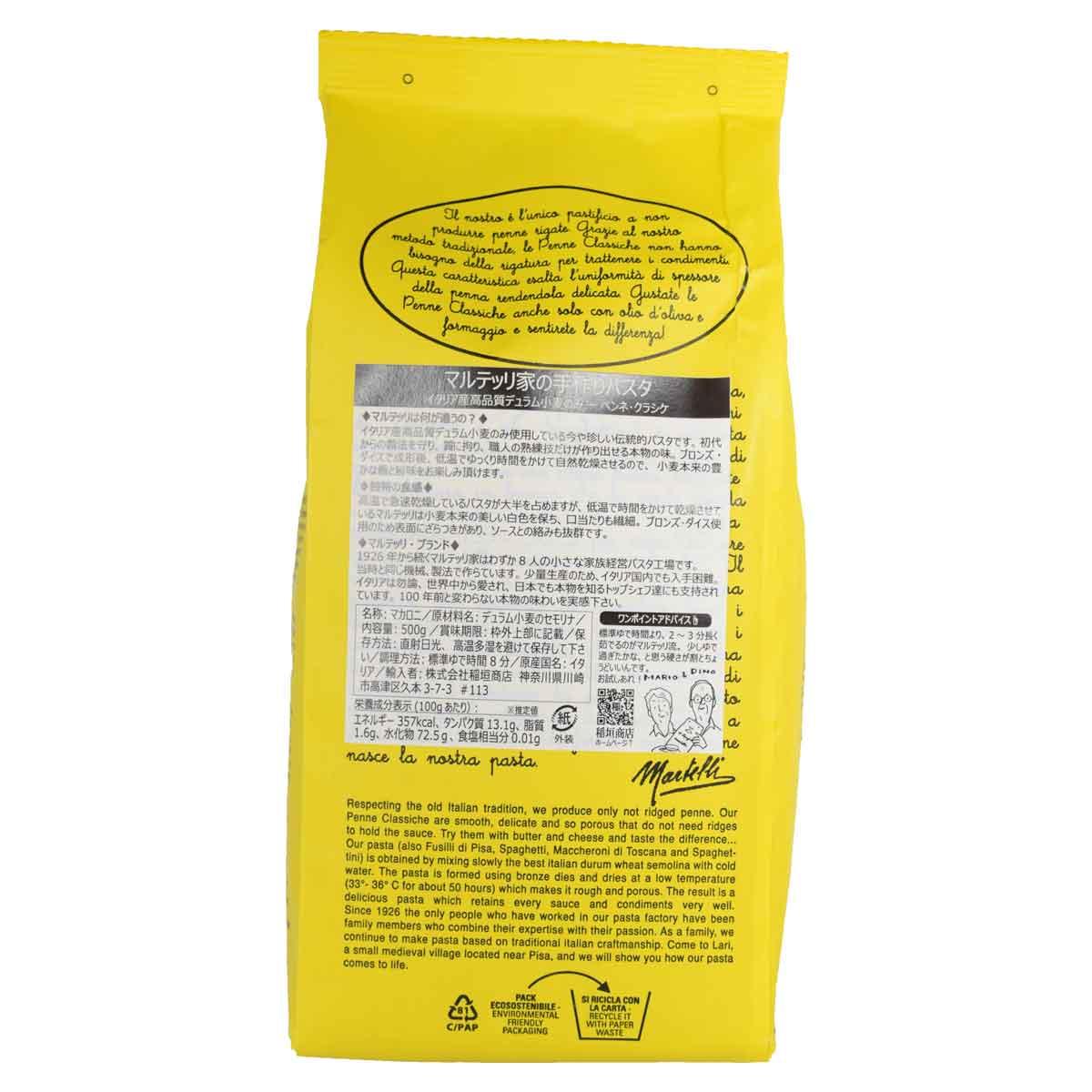 | 伝統的にパスタはローマでは青い袋、トスカーナでは黄色の袋に入れられて売られていまし た。マルテッリの黄色い袋はトスカーナの伝統を今に残す意志の表れなのです。トスカーナ 州、ピサ丘陵の中世の面影を残す小さな丘の村、ラーリ。 1926 年、この村にマルテッリが設立されました。以来、伝統的で最高品質なパスタをマル テッリ一族のみで作り続けてきました。そして、今も家族 8 人だけで運営されています。 今では農業が近代化され、パスタ作りも近代化されました。安価な輸入小麦を使い、工 場で大量に素早く作られるパスタが主流となってしまいましたが、彼等の原材料は全てイタ リア産。伝統的なセモリナ挽き硬質小麦粉を原料とし、今や一般的になった機械乾燥で はなく、自然乾燥による職人的製法を、いまだに続けているのがマルテッリ。今では非常に 珍しい本物のパスタです。 | |