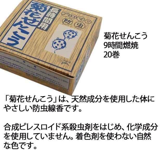 | 「菊花せんこう」は、天然成分を使用した体にやさしい防虫線香です。 合成ピレスロイド系殺虫剤をはじめ、化学成分を使用していません。着色剤を使わない自然な色です。燃焼時間は約9時間です。 | |