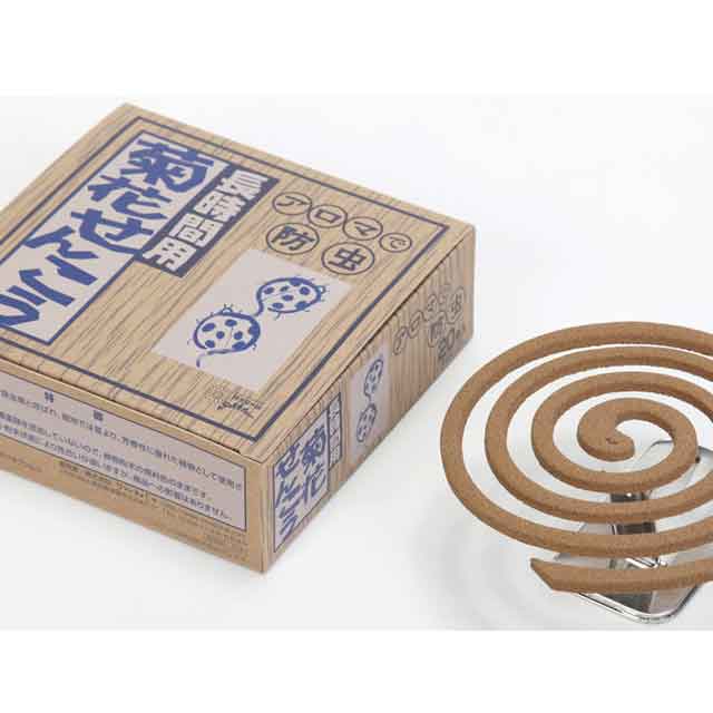 | ■原材料 | <使用原料> 除虫菊粉末(粉末として10%、総ピレトリンとして0.1%)、除虫菊粕粉、タブ粉、でんぷん、木粉、薄荷、陳皮 ※着色料、防腐剤不使用 *ブリキ製線香立具付き |