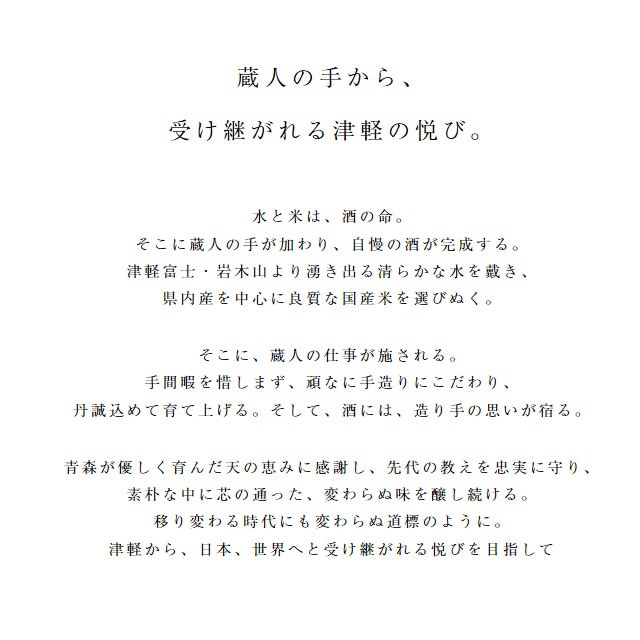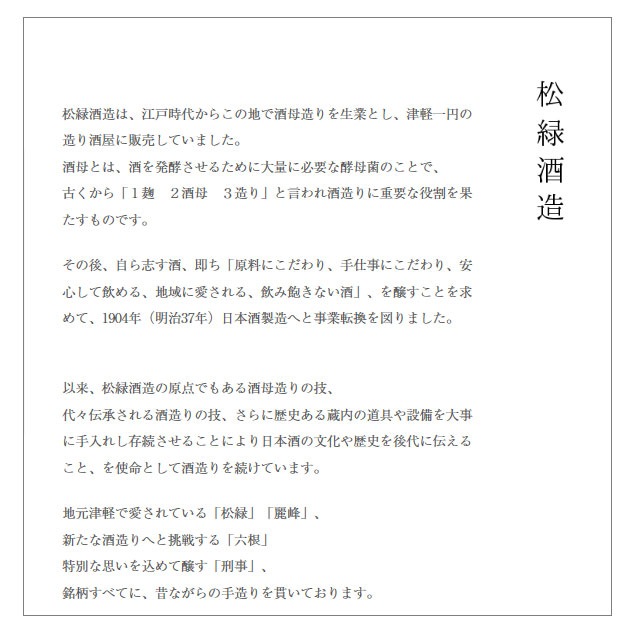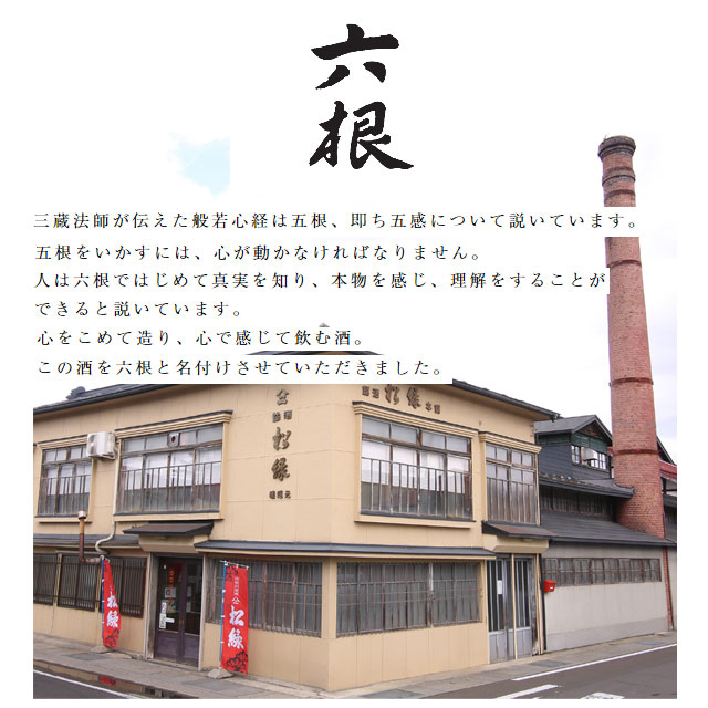 | 飲みやすさの中にも、酒造好適米、華吹雪が醸し出す複雑で繊細な味わいが愉しめます。冷酒または、ぬる燗がお勧め。バランスの良さを是非ご堪能下さい。三蔵法師が伝えた般若心経は五根、即ち五感について説いています。五根をいかすには、心が動かなければなりません。人は六根ではじめて真実を知り、本物を感じ、理解をすることができると説いています。心をこめて造り、心で感じて飲む酒。この酒を六根と名付けさせていただきました。 | |