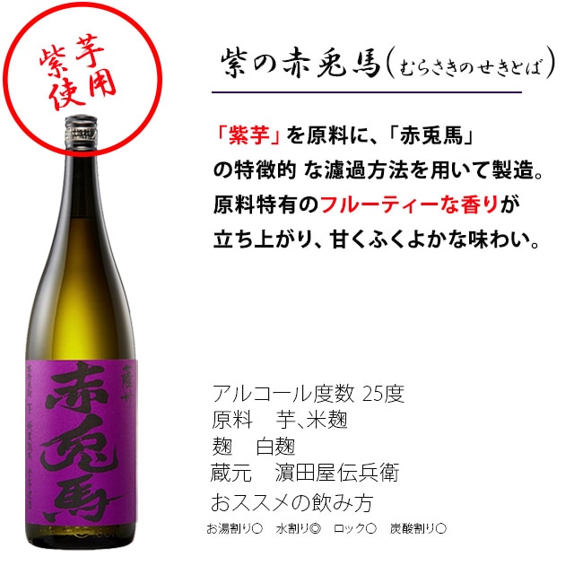 | 赤兎馬(せきとば)の華やかな香りはそのままですが、紫芋らしいフルティーな香りとやわらかな甘みが加わって、なんとも言えない感動的な味わいに仕上がりの「紫の赤兎馬」。芋焼酎 焼酎 送料無料 紫の赤兎馬 赤兎馬 1.8L 1800ml 紫芋 | |